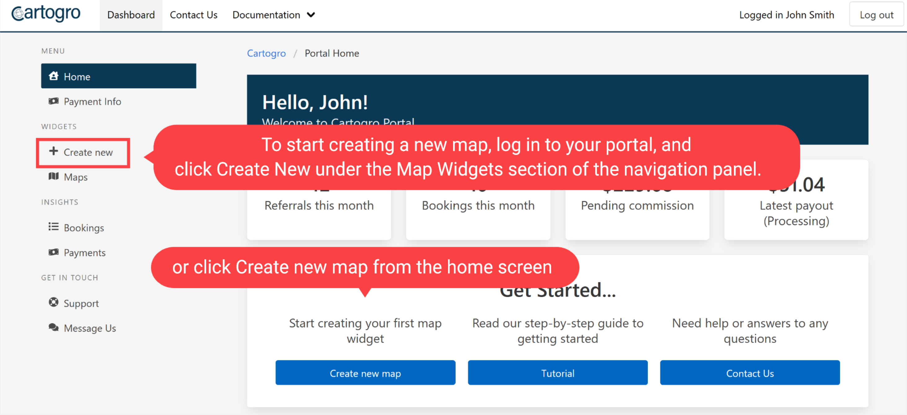 To start creating a new map, log in to your portal, and click Create New under the Map Widgets section of the navigation panel.