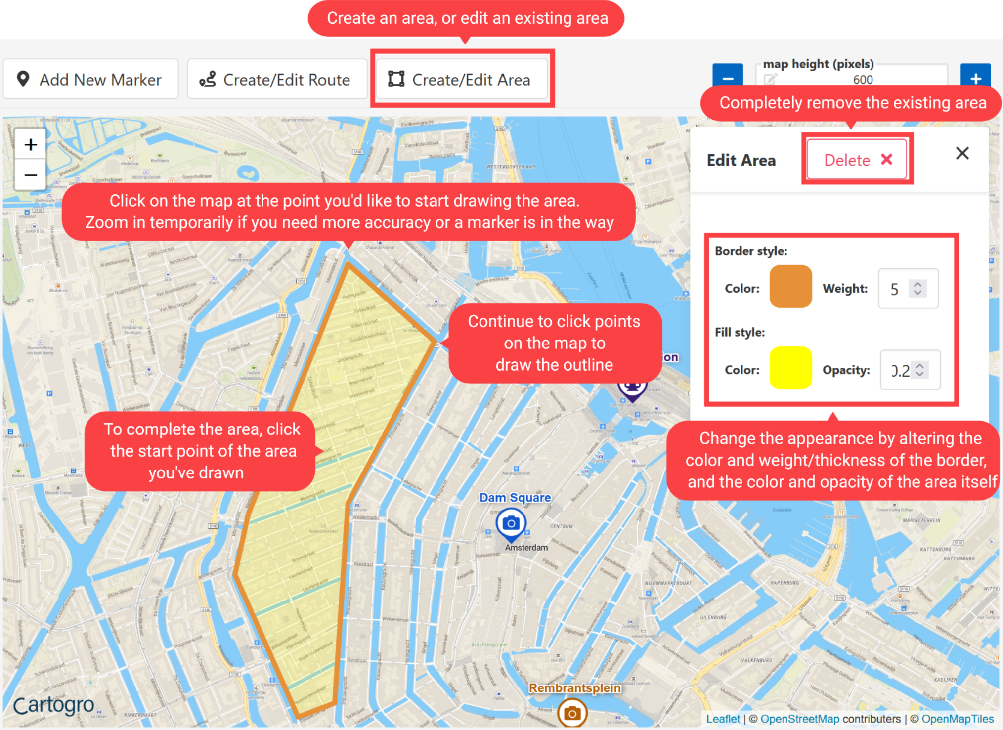 You can also draw an Area to highlight a region of your map, this works similar to creating a Route.